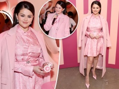 Selena Gomez matches her all-pink outfit to her blush at Rare Beauty event